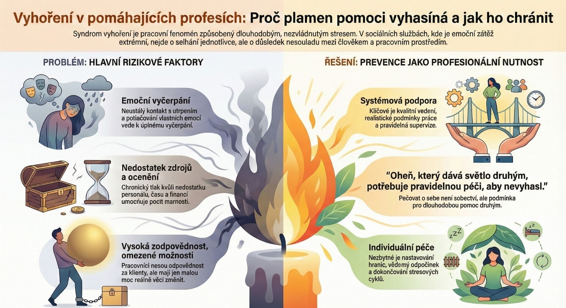 Současné poznatky i praxe ukazují, že vyhoření není selháním jednotlivce, ale důsledkem nesouladu mezi člověkem a pracovním prostředím. V sociálních službách se tento nesoulad nejčastěji projevuje v několika oblastech: